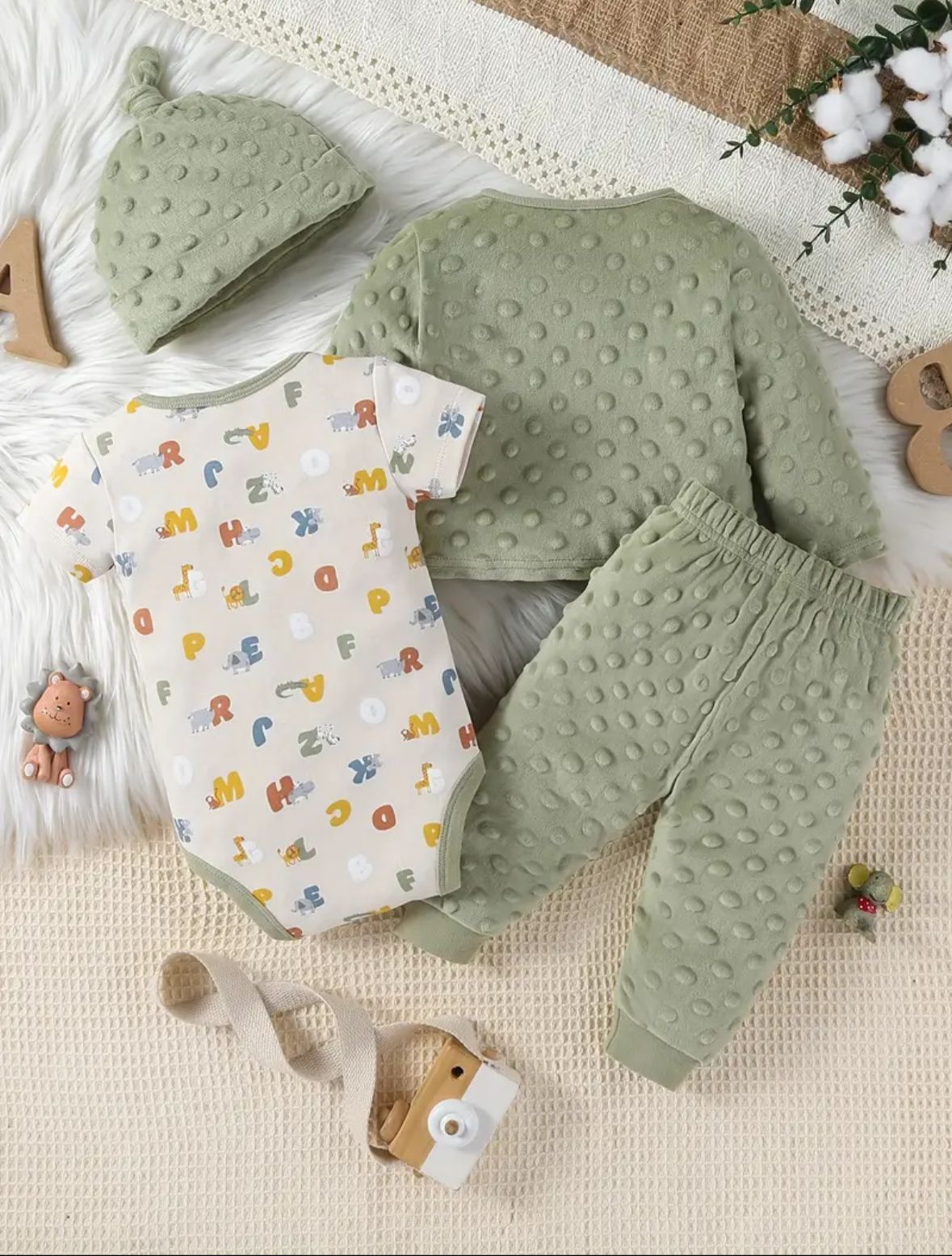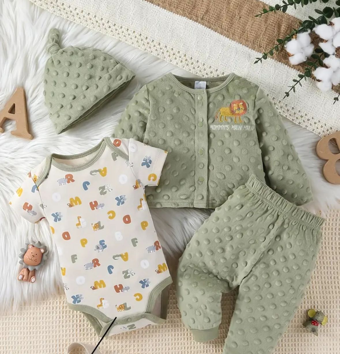 Conjunto de 4 piezas 100% algodón para acompañar cada momento de tu bebé con suavidad y estilo.